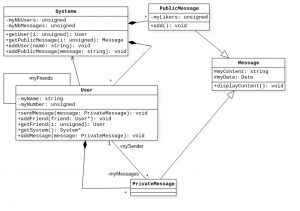 Dans l’espace de noms anonyme du fichier main.cpp déclarer la classe PrivateMessage, comme elle est décrite sur le schéma UML. Le constructeur a la tâche supplémentaire d’initialiser le lien avec l’User.